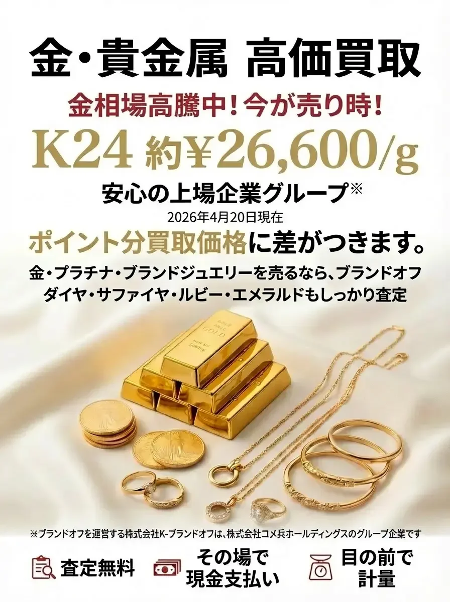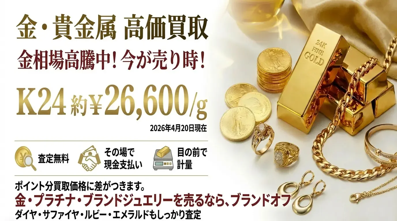 BRAND OFFは、東証スタンダード上場企業コメ兵ホールディングスが100%出資するブランド買取専門店です。ブランド・宝飾部門で4年連続No.1の実績があり、宝石・貴金属の専門鑑定士が常駐しています。目の前での計量と査定額の透明な説明を徹底し、数千万円単位のお取引でもその場で現金をお支払いいたします。独自のグローバル販売ルートにより、他社より高い買取価格を実現しています。